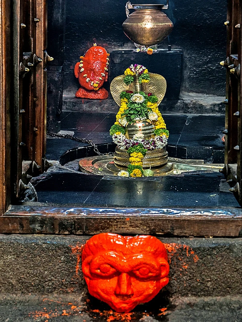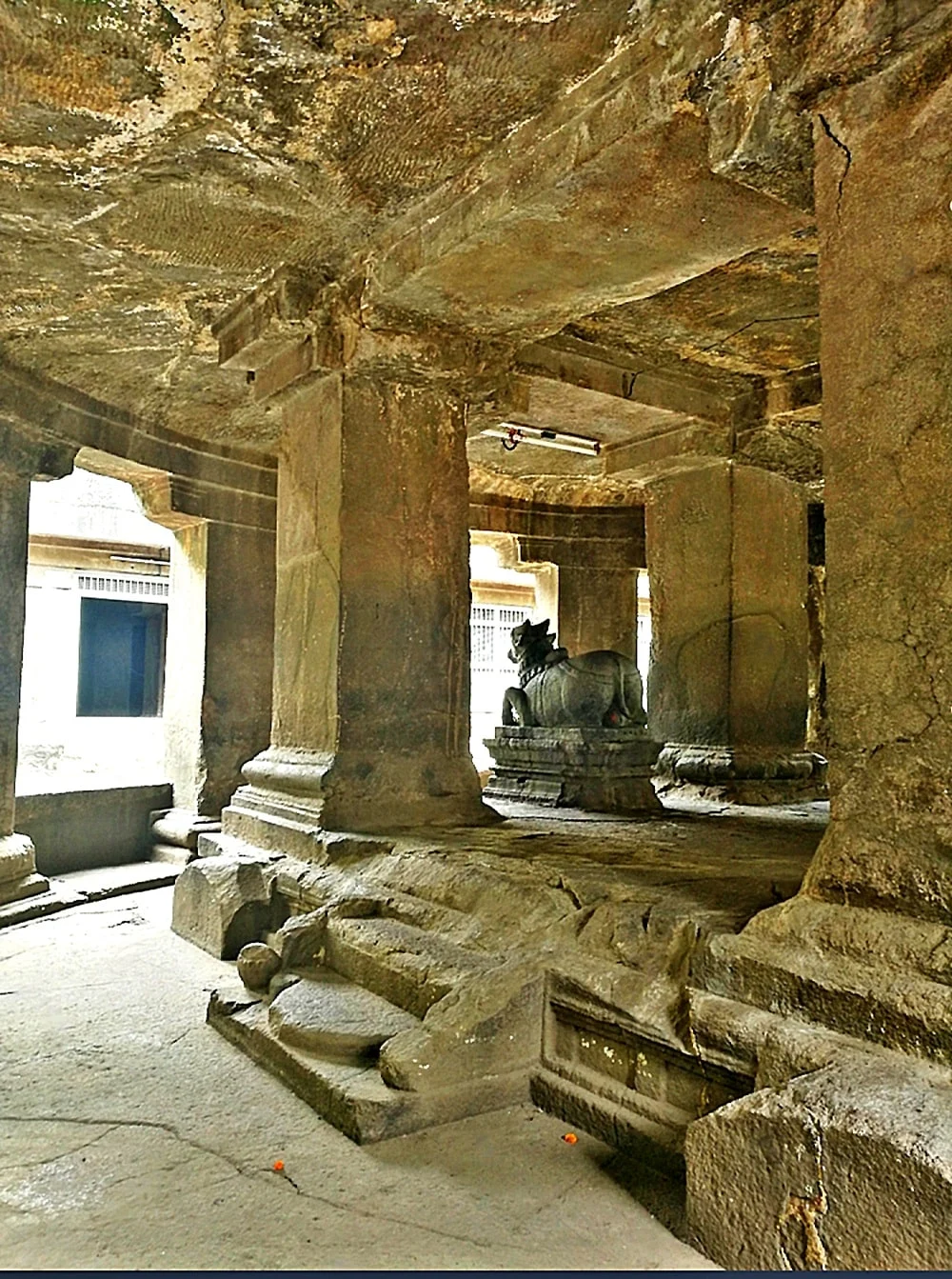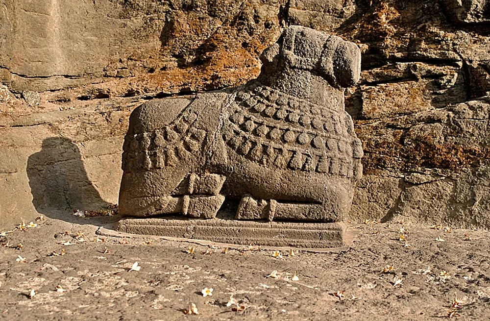The layout centers around a circular Nandi pavilion hewn from a single rock, with 16 pillars (12 on the outer ring and 4 within) supporting a majestic rotunda and platform where Nandi gazes at the sanctum through a rain-washed courtyard shaded by old trees. Inside, the temple’s pillared sabhamandap is plain but powerful—30 square columns frame the assembly space, marked by semi-finished and unfinished relief panels hinting at its incomplete status. The sanctum houses bronze-clad Shiva (Pataleshwar) linga, with connected shrines for Ganesh and Parvati, and new marble idols of Ram, Lakshman, and Sita installed in the inner recesses