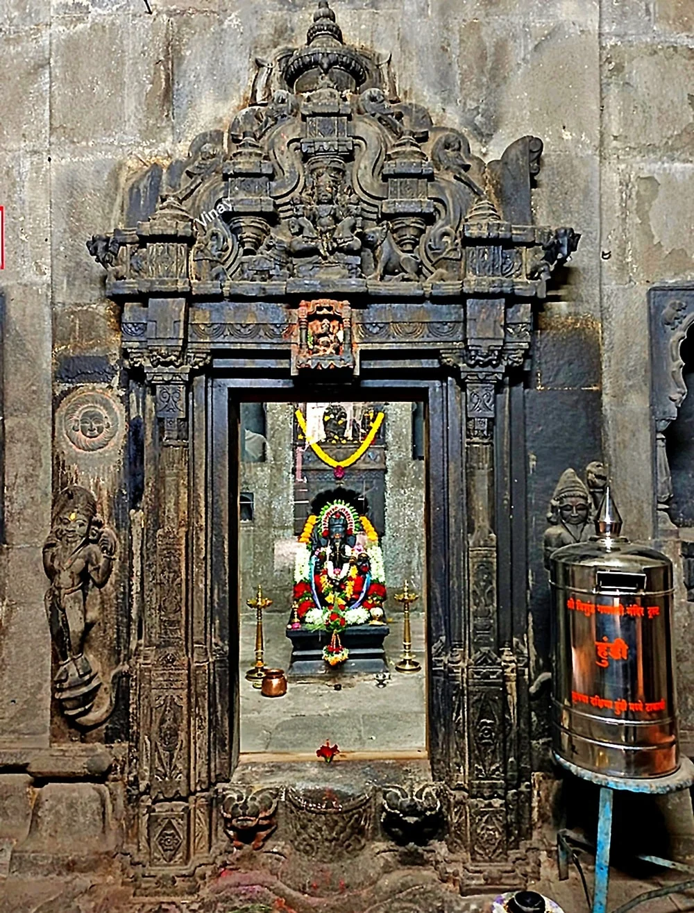 The sanctum houses not just Ganapati but also layered symbolism—behind the idol is a Sheshashayi Vishnu and Ganesh yantra, while the circumambulatory path reveals carvings fusing Shiva, Vishnu, Varaha, and Naga imagery, reflecting divine unity. The temple walls display Nataraja, Kaal Bhairav, and rare sculpted motifs, along with a political relief depicting a British soldier chaining a rhinoceros, historically representing Bengal and early colonial India